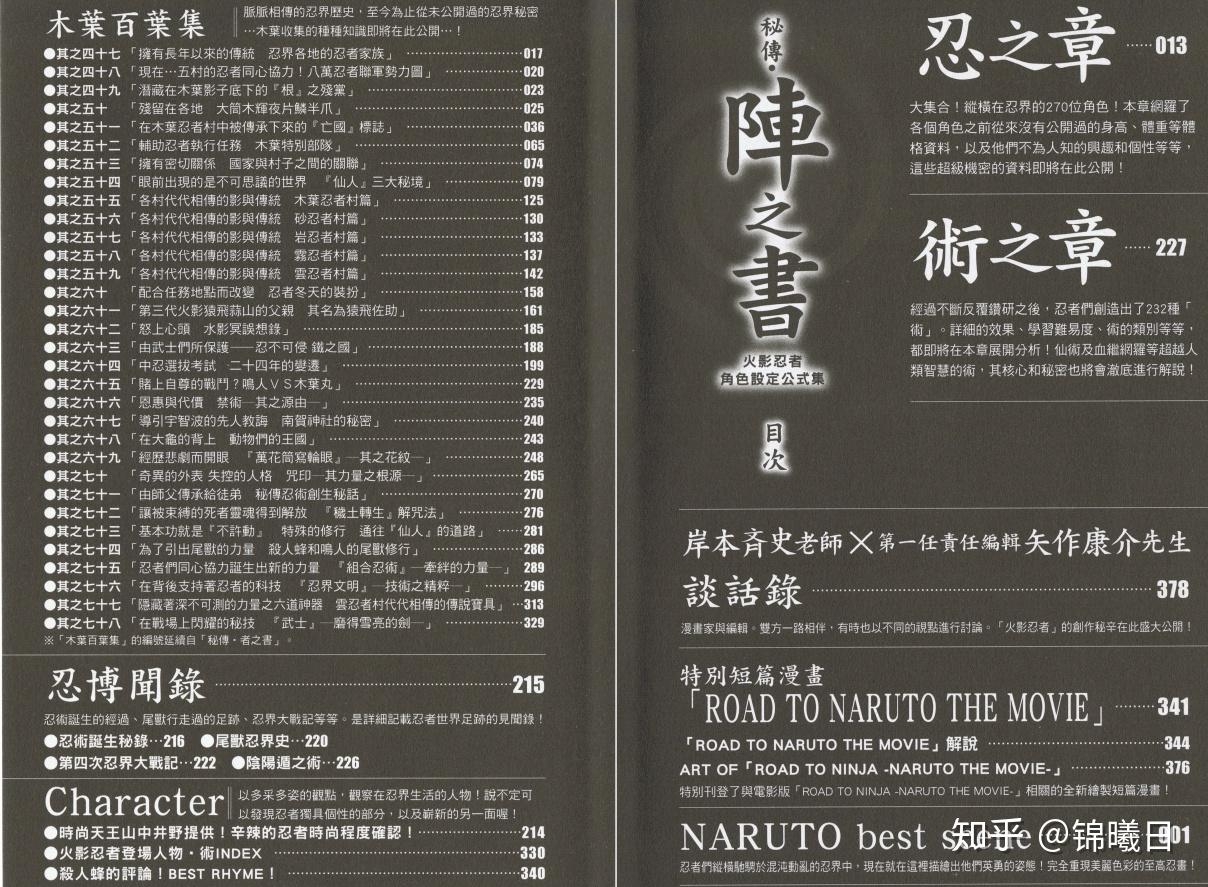 作为现存最大,记载最全面也是最厚的一本,《阵之书》在某种程度上其实也能称之为是《火影》最成功的一本设定集,其记载的是从第44卷到漫画第691话的内容(所以其实《阵之书》也并没有收录全部的内容)。