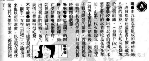 而现在网络上的扫描版事实上也并不是东立台版的内容,而是汉化组在拿到初版扫描之后自行汉化的,所以在有的内容上并不准确(后续公式书再版修改/汉化组在汉化时加入了自己的理解),比如这里对老紫的介绍,还是所谓的“溶遁忍术”,“溶遁”与“熔遁”这一点也是当时动画组搞的乌龙之一(动画组在五影会谈把照美冥的“溶遁”错误理解为了“熔遁”)