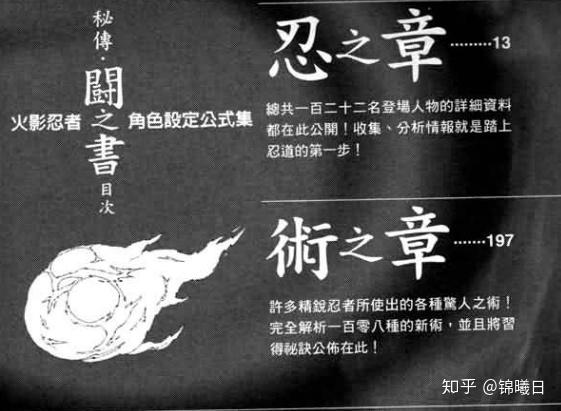 《兵之书》(港版)部分目录但是相对的,《兵之书》中对角色的介绍少之又少(主要就是对第七班、伊鲁卡这几人的介绍),对忍术的词条更是几乎没有,整本书的前半部分算是在解释世界观,后半部分则都是些粉丝向的游戏等内容,所以《兵之书》也常常是被排除在外的一本公式书。