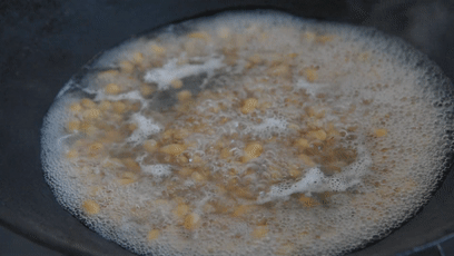 2.炒香后加入清水(水要没过黄豆),大火烧开后转中火煮熟,将黄豆舀出沥干水分、放凉。