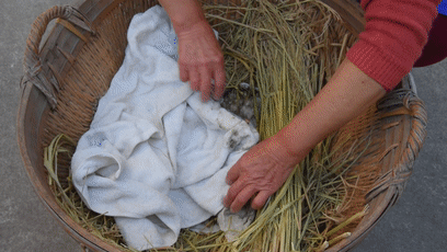 3.准备一个箩筐,在箩筐底部依次放入稻草(或麦秆)和黄豆,再盖上一层稻草(或麦秆),保温发酵一周。