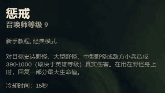*惩戒在升级前无法对英雄使用,只能对野怪、小兵和英雄召唤物使用。如果对野怪使用,会恢复自己70+10%最大生命值的血量