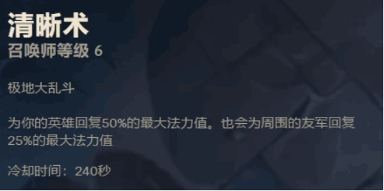 清晰术无法在召唤师峡谷主动携带,但是可以通过基石符文“启封的秘籍”在召唤师峡谷出现,因此稍微提一句。清晰术效果也很明显,没什么好多解释的,纯恢复状态的技能。对使用非法力值的特殊资源条角色无效。
