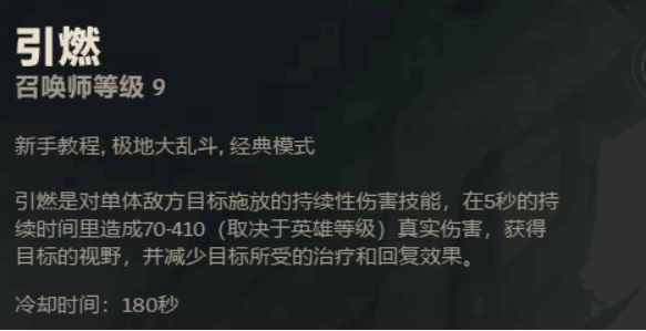 *引燃也是LOL冷却时间最短的召唤师技能之一,并且施法操作非常简单,只需要对拼的时候挂上就可以大幅增加击杀的机会。因此点燃是LOL中(除闪现外)最推荐新手携带的召唤师技能之一