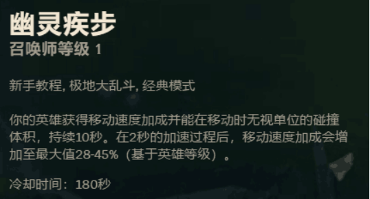 *长达10秒持续时间内,大幅增加你的英雄移动速度,最常用的使用方法是在追击和先手开团的时候使用。