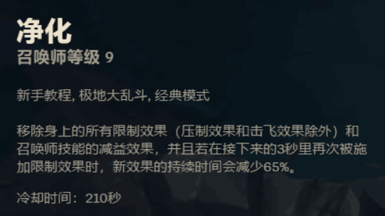 *净化是一个针对型的召唤师技能,专门针对拥有长时间控制技能的英雄。一般都是在已经知道敌方英雄阵容后考虑选出的。