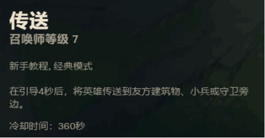 *虽然虚弱单挑很强,但是大多数情况下是由辅助携带来在对面突进后排时保护队友,极少情况下中单英雄对阵地方刺客也会携带。5)传送