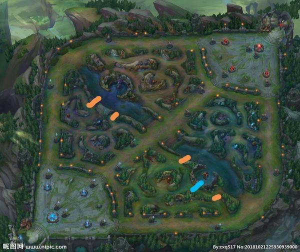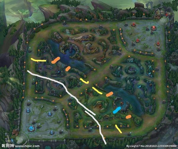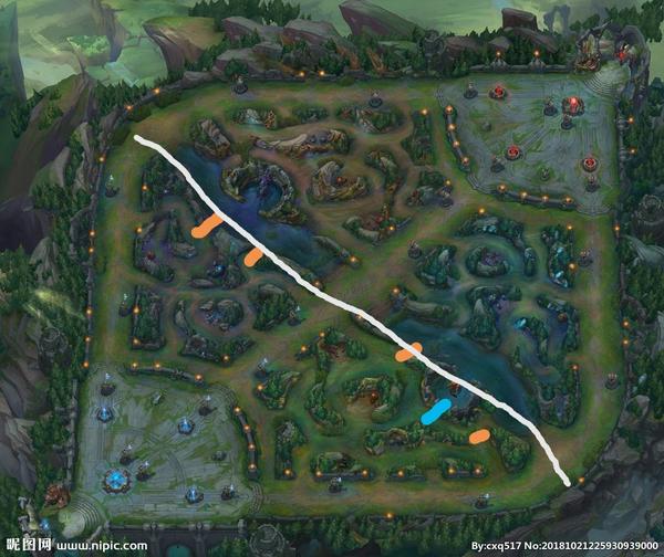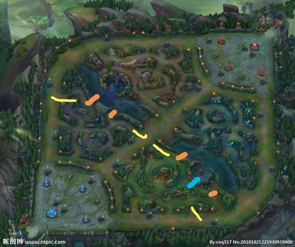 如图,当你在上路橙色点位处时,你站在己方防御塔前,敌方打野(河道紫色点)想要攻击你,只有蓝色一条路可以走,而且走上来就被你看到了,因为红色路将会被防御塔发现并攻击,除非你残血被越塔,一般情况下红色路径是此路不通的。因此,我们可以认为站在橙色点位,防御塔下是比较安全的。