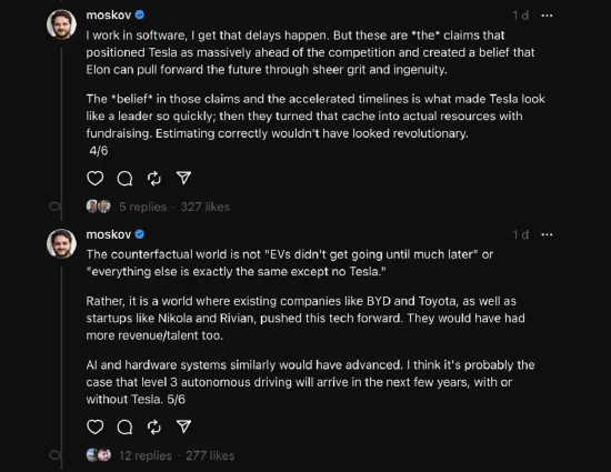 他的怀疑主要集中在马斯克的两家公司,特斯拉和SpaceX,可能不像他们经常被描绘的那样具有革命性。“如果它们真的是建立在外在的谎言之上,而不仅仅是自欺欺人(玫瑰色眼镜),那么我们真的应该把它们视为他侥幸逃脱惩罚的骗局。”