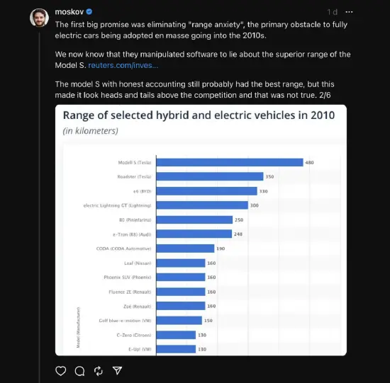 这位Facebook联合创始人特别针对特斯拉电动汽车的预期续航里程提出质疑,最近有报道称,特斯拉的预期续航里程可能被夸大了,以显示该公司是行业领导者。该公司还成立了一个秘密团队来压制与续航里程问题相关的投诉。