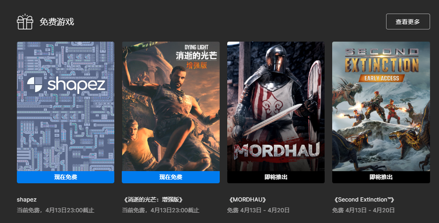 4月7日消息,在昨日夜间,Epic更新了本周的免费喜加二内容,截止到下周4夜间,Epic用户可以免费领取《消逝的光芒》和《Shapez - 异形工厂》两款游戏,而其将在下周送出《Second Extinction》和《Mordhau》。