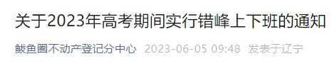 此外,辽宁营口“鲅鱼圈不动产登记分中心”微信公众号发文称,为创造良好的交通环境,保障高考有序进行,按照相关部门要求,现就高考期间实行错峰上班通告如下:6月7日-6月9日上班时间为9:00 。