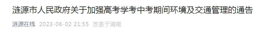 近日,“涟源在线”发布“涟源市人民政府关于加强高考学考中考期间环境及交通管理的通告”,其中,高考期间(6月7日至9日),全市中心城区行政、事业单位上班时间延迟至9:00,下午上班时间延迟至15:00 ,上午、下午下班时间均不变。