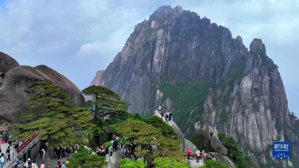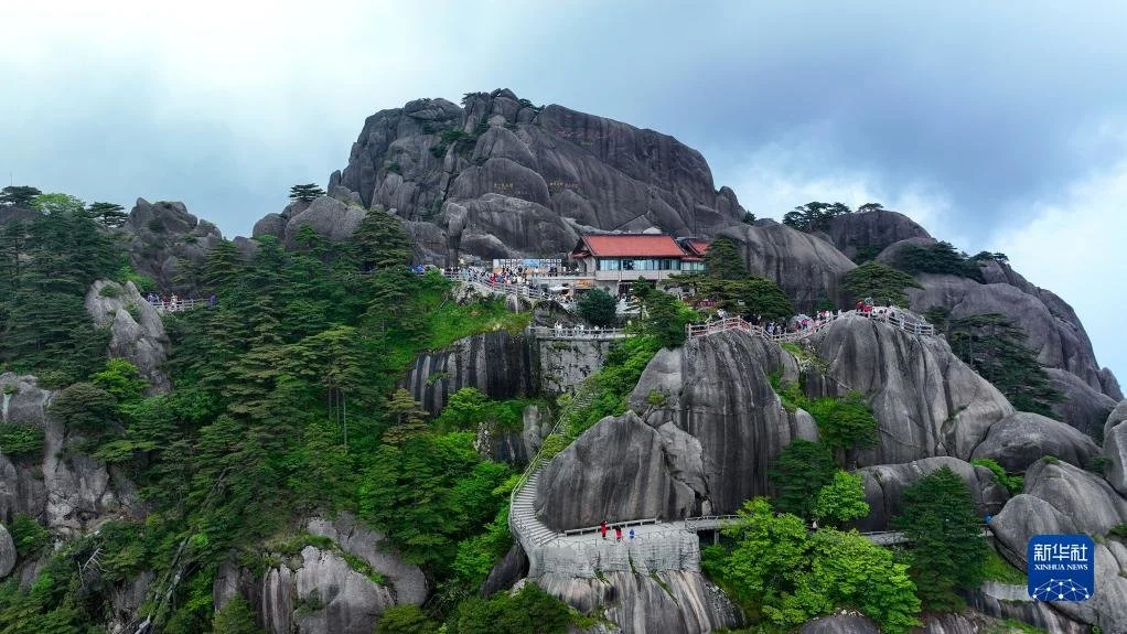 5月18日,游客在安徽黄山风景区玉屏景区游览(无人机照片)。