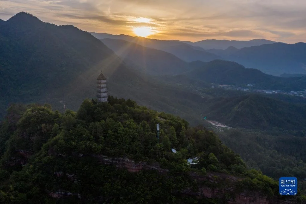 5月16日,在浙江省台州市天台县,清晨的阳光照在赤城山顶的梁妃塔上(无人机照片)。