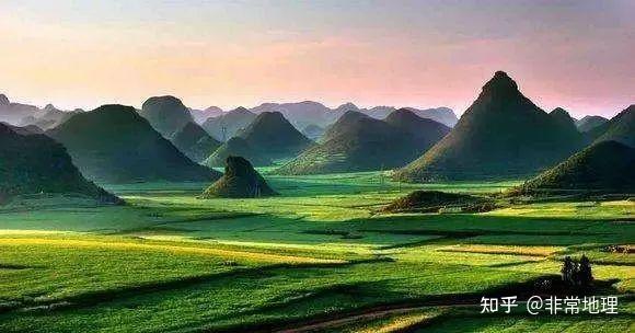 云南罗平金鸡峰丛峰林:岩溶地区成群分布的,基部分离,相对高度在100-200m左右,坡度一般在45°以上的岩溶山峰群。