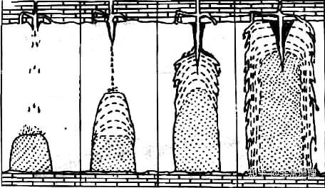 沉陷漏斗:在有较厚的松散沉积物或砂岩覆盖的岩溶地区,如有通往地下的裂隙,水流在下渗过程中,带走一部分细粒的砂和黏土物质使地面下沉形成沉陷漏斗。