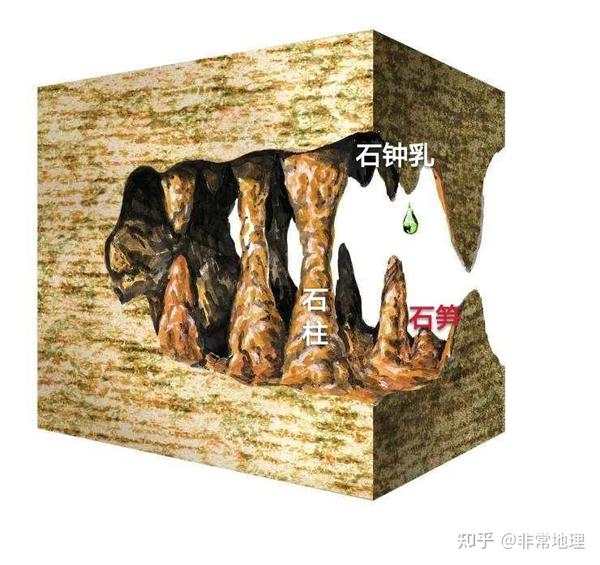 石笋、石柱和石钟乳当水滴从石钟乳上跌落至洞底时,变成许多小水珠或流动的水膜,这样就使原来已含过量CO2的水滴有了更大的表面积,促进了CO2的逸散。因此,在洞底产生碳酸钙堆积。