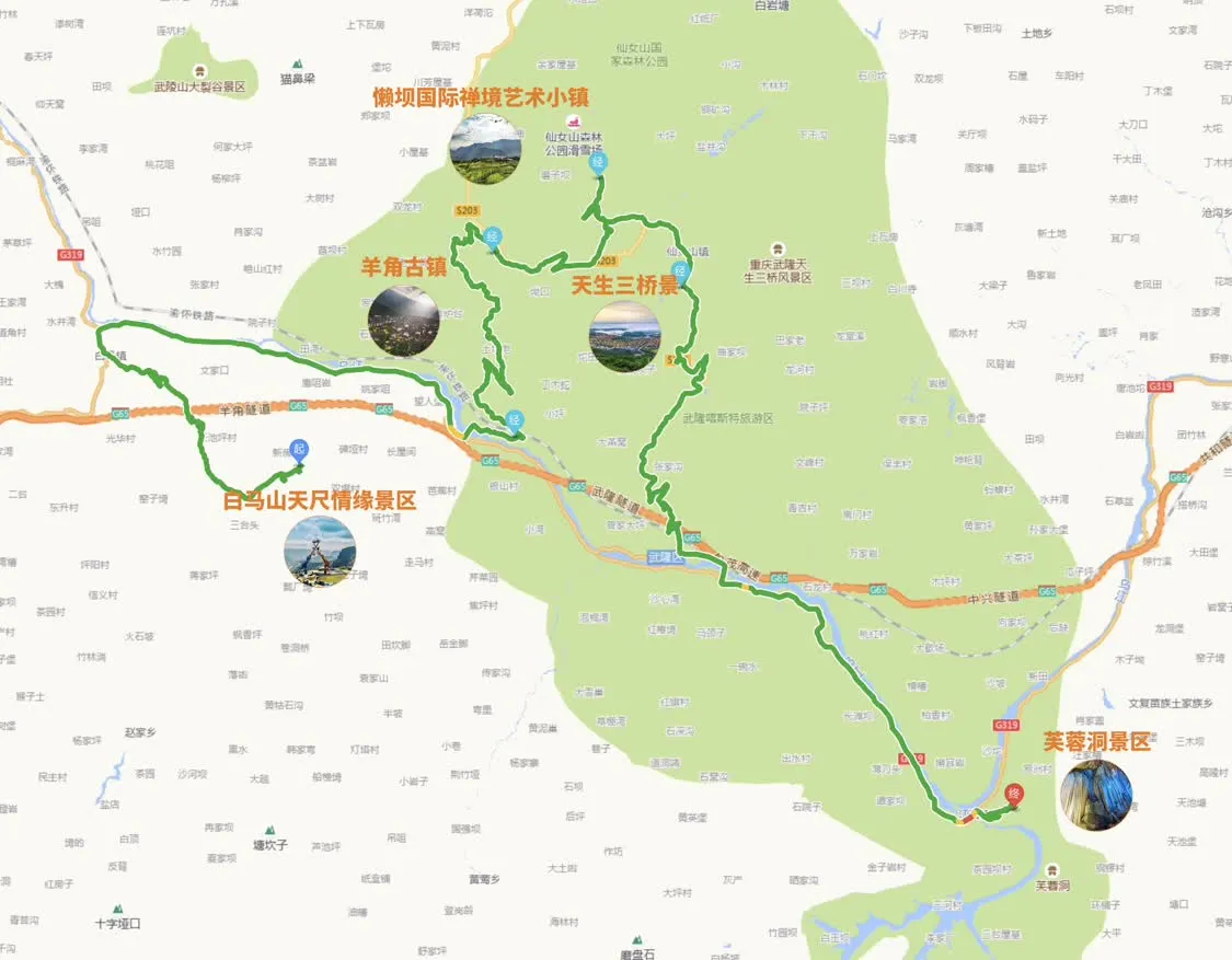 具体路线:从懒坝国际禅境艺术度假区出发,途经S203、武仙路,到达仙女山景区。再从仙女山景区出发,途径武仙路、龙桥街,到达天生三桥景区。最后从天生三桥景区出发,途经S203、厦成线,到达芙蓉洞景区。