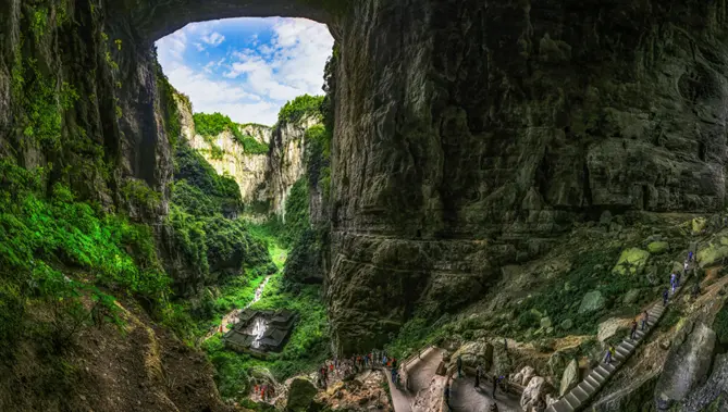 武隆天坑又名天生三桥,是全国罕见的地质奇观生态型旅游区,属典型的喀斯特地貌。景区内林森木秀、飞泉流瀑,包容了山、水、雾、泉、峡、峰、溪、瀑等景致,是一处高品位的生态旅游区。