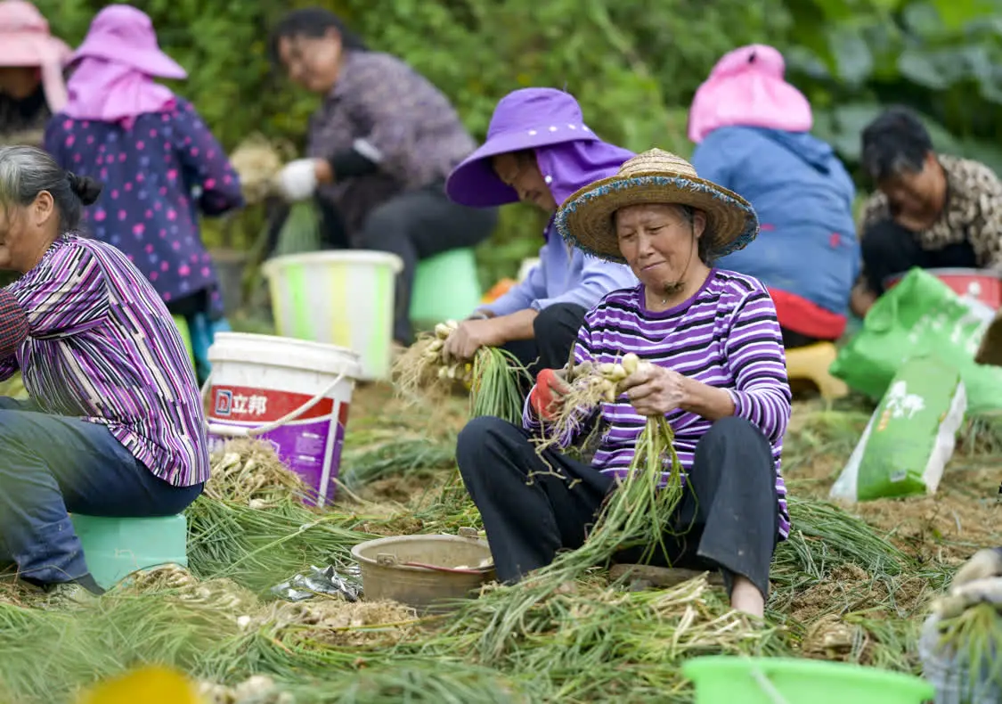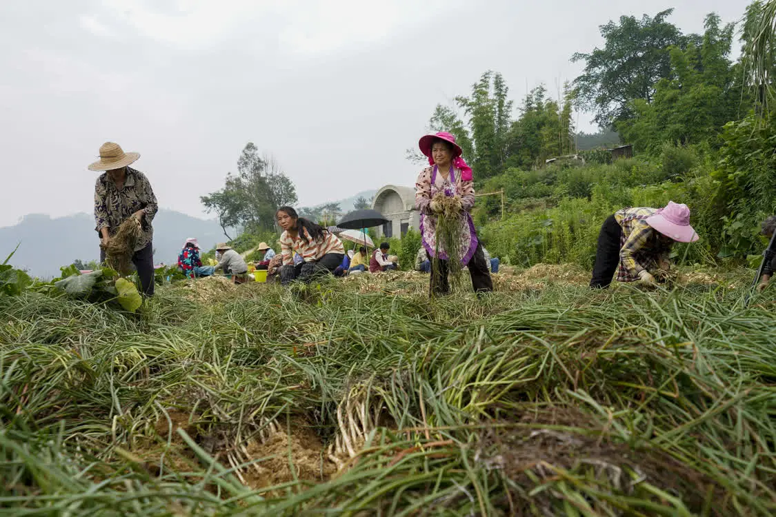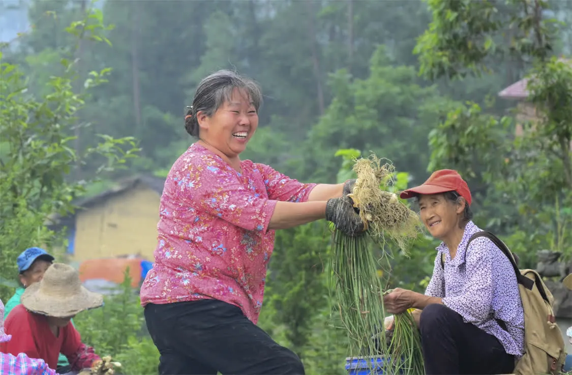 6月8日,在丰都县虎威镇大池社区的藠头田,当地村民在种植大户的组织下集体采收藠头。 新华社发(李晓琳 摄)