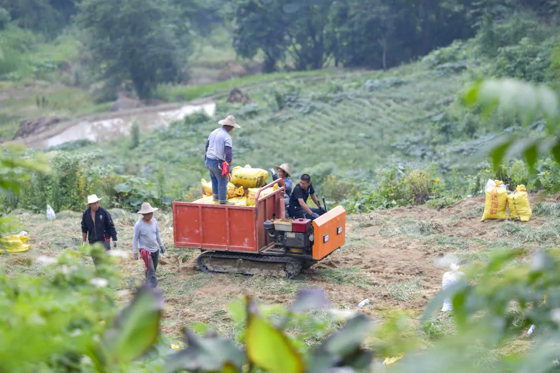 6月8日,在丰都县虎威镇大池社区的藠头田,当地村民用小型农机转运采收的藠头。 新华社发 (李晓琳 摄)