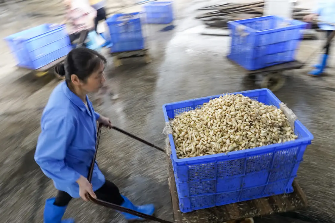 6月8日,在丰都藠头出口龙头企业重庆丰都明富实业有限公司的加工车间,一名工人转运初洗后的藠头。 新华社记者 刘潺 摄