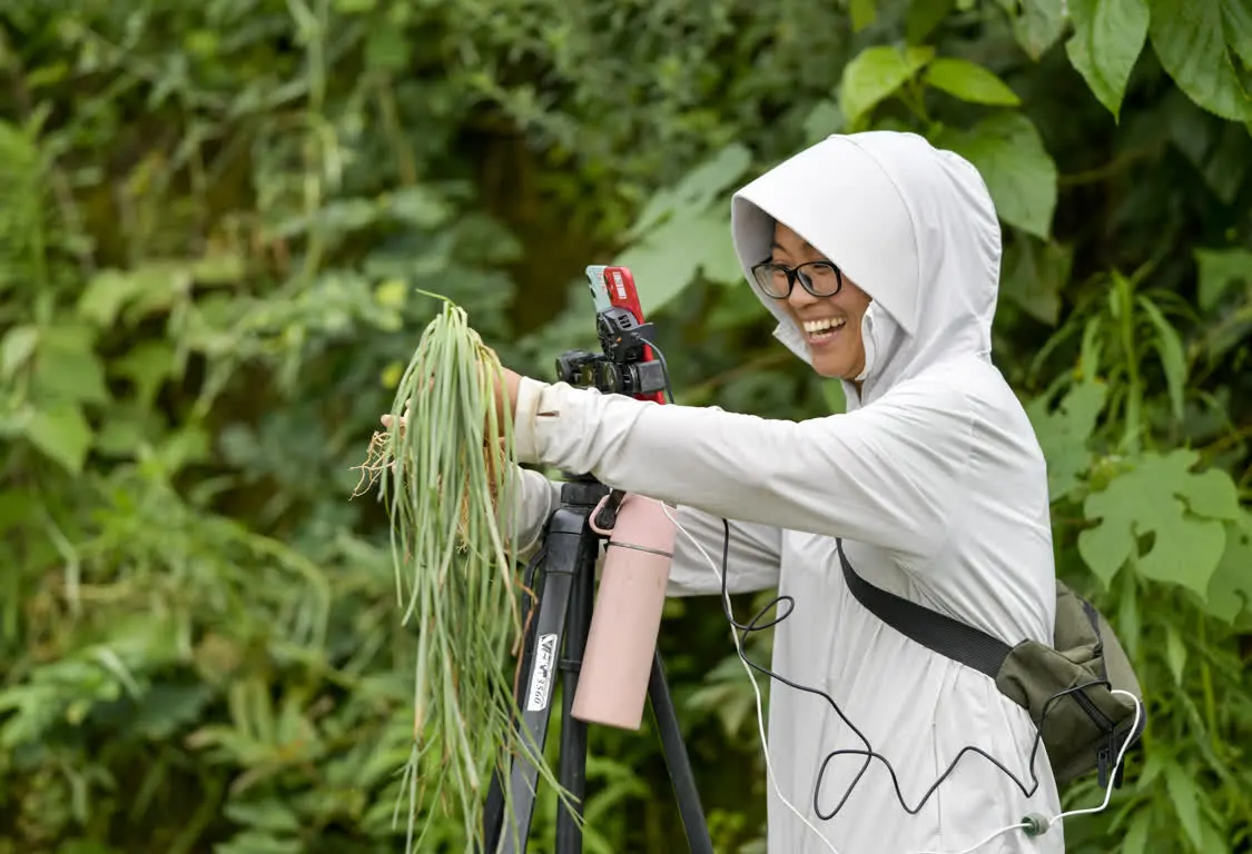6月8日,在丰都县虎威镇大池社区的藠头田,一名网络主播通过网络推介丰都藠头。 新华社发 (李晓琳 摄)