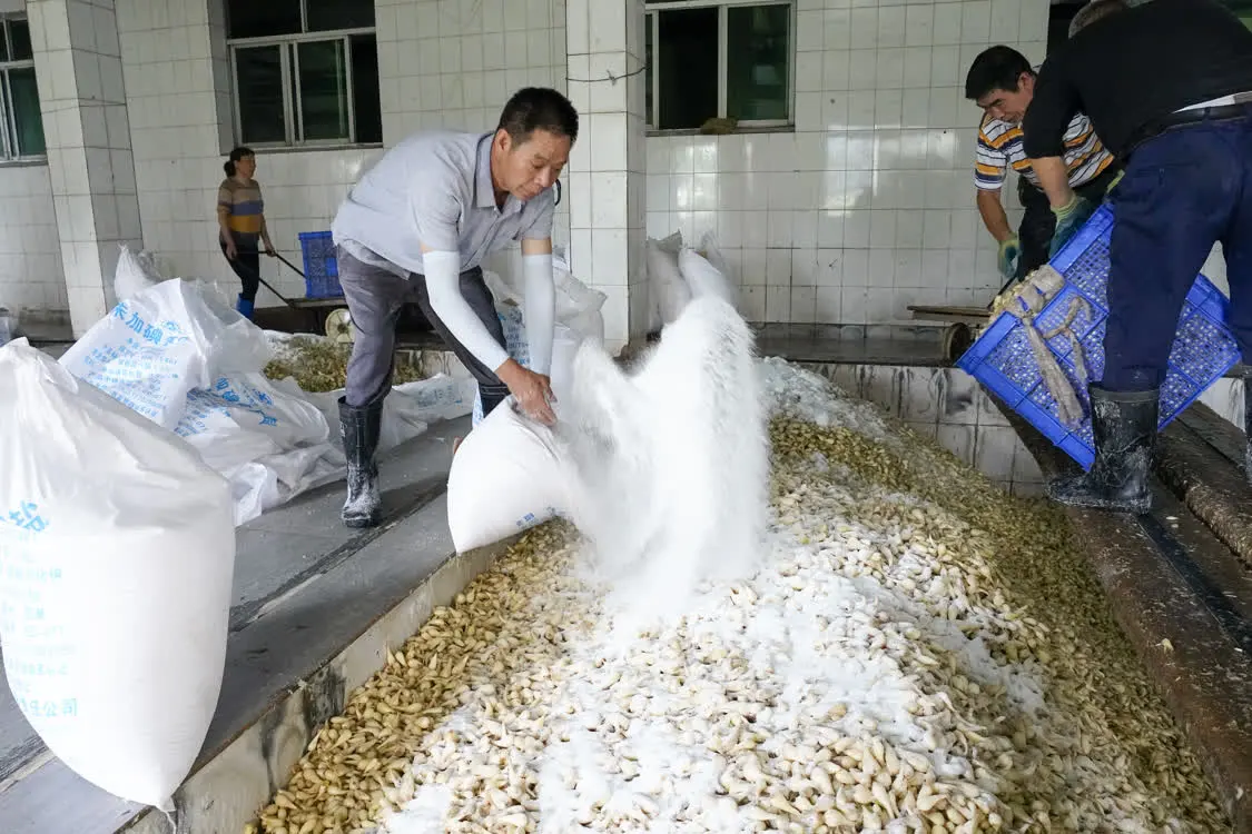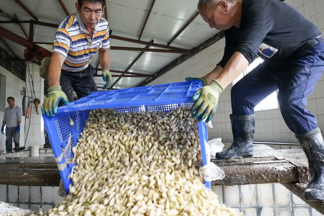 6月8日,在丰都藠头出口龙头企业重庆丰都明富实业有限公司的加工车间,工人们将初洗后的藠头放入腌制池内进行腌制。 新华社记者 刘潺 摄