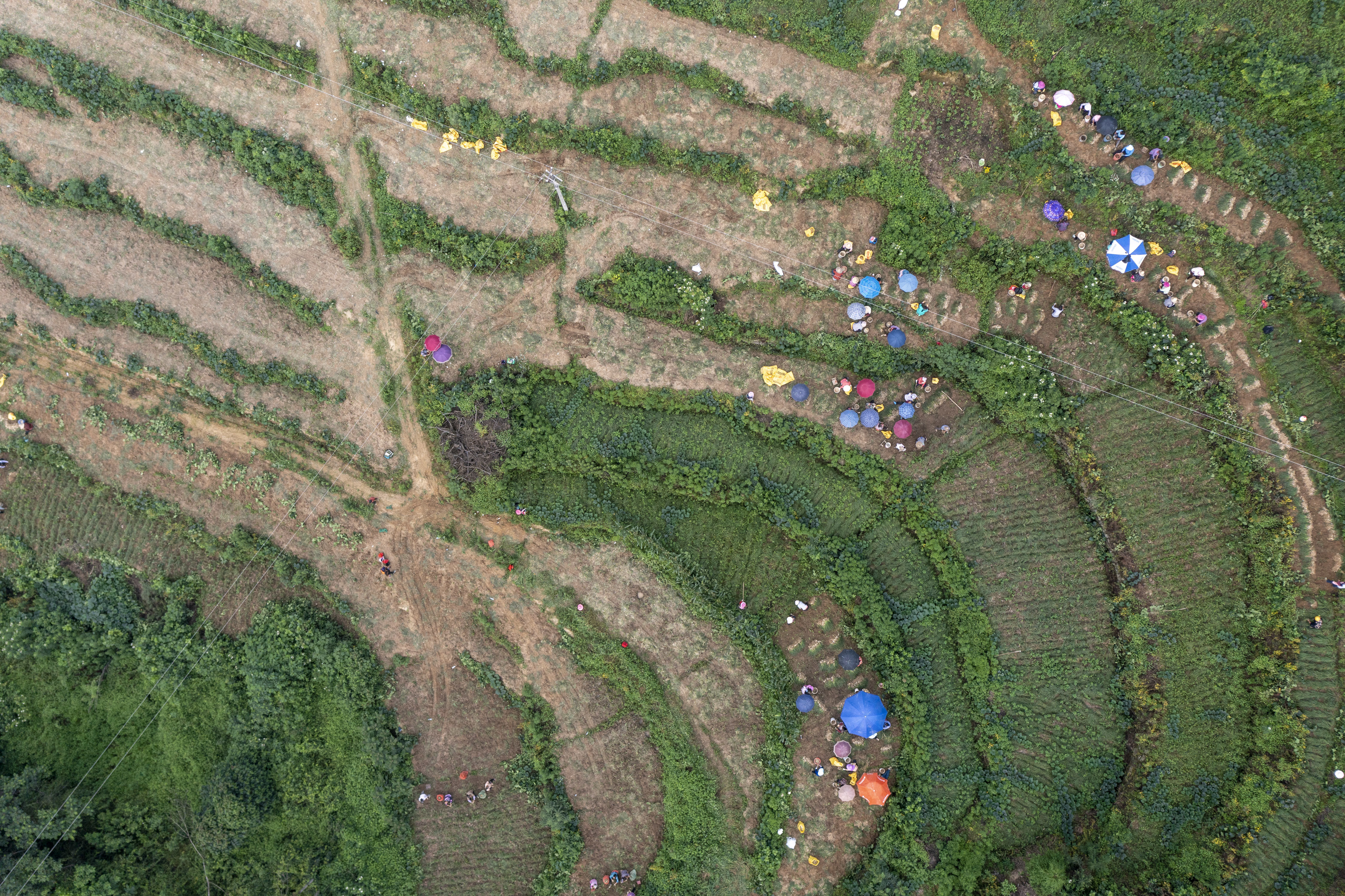 6月8日,在丰都县虎威镇大池社区的藠头田,当地村民在种植大户的组织下集体采收藠头(无人机照片) 。新华社记者 刘潺 摄