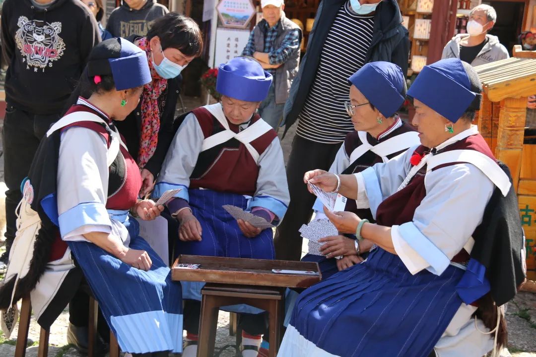 在四方街,身着民族服饰的纳西阿奶悠闲地打着桥牌,卖鸭蛋的阿妈与顾客热络地聊起了天,赶集的母女想着在街上买一对最漂亮的羊皮披肩肩带……