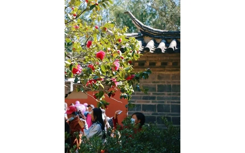 三多节赏花、踏青去哪里?玉峰寺是绝对不能错过的赏花胜地,寺内山茶花开得正艳。对于不少丽江人来说,在玉峰寺赏花是三多节必备的“仪式感”。除了赏花外,寺内还开展了非遗文化展演活动。非遗传承人的精彩表演赢得了阵阵掌声。