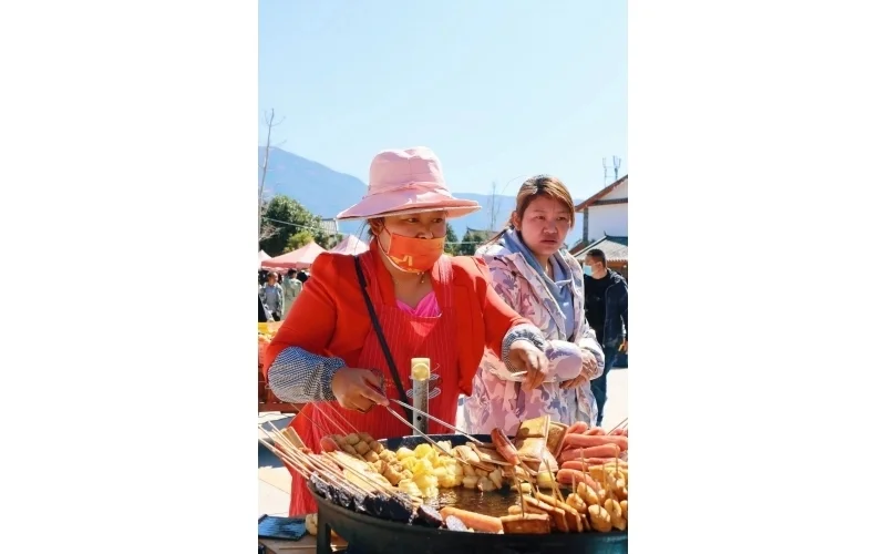 广场内,还有群众自发开展的商业交流活动,各种丽江传统小吃、民间特产以及水果、服装、手工艺品、花卉,人们问价购买,十分热闹。