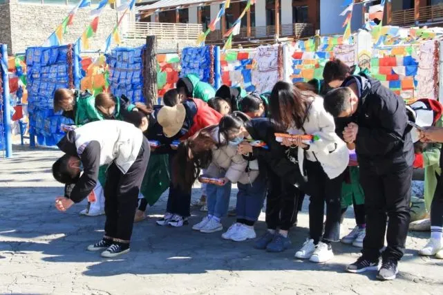 祈福完毕后,不少游客带着“三多”的祝福,亲手在祈福台上绕上经幡,不同的颜色的经幡迎风飞舞,象征着不同的美好寓意,有对家人健康的祈福、有对爱情的甜蜜祝福、更有对美好生活的向往。