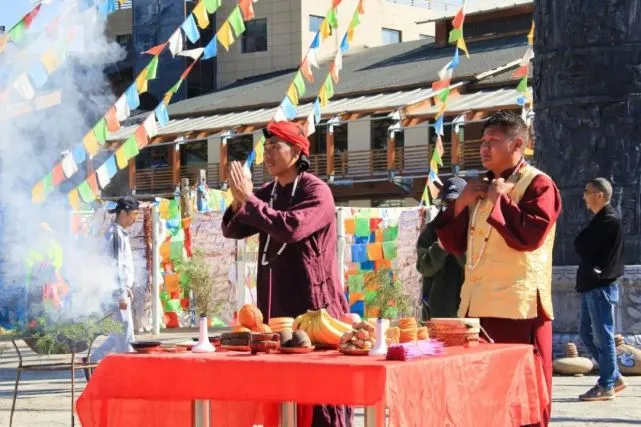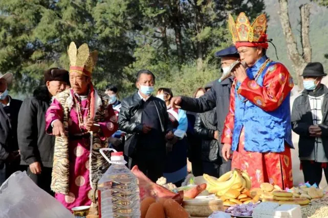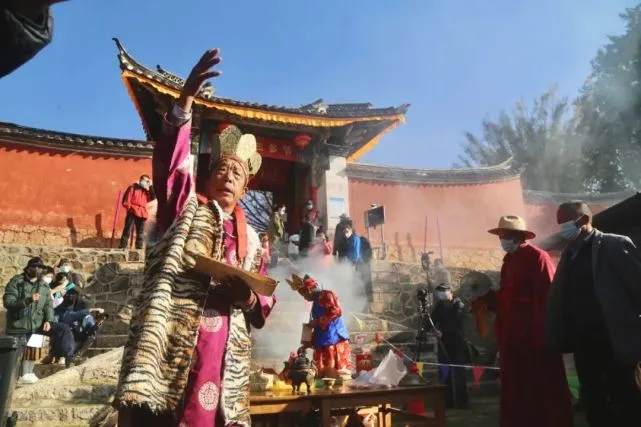 活动开始,纳西东巴举行了传统的祭祀活动,祭祀台上摆着各种各样的祭品,纳西东巴诵经、点香、跪拜、跳舞向三多祈福,体现出纳西人对三多神无限的崇敬。