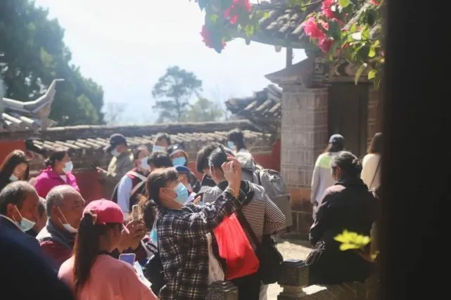 祭拜过三多神,人们继续往山上的玉峰寺出发,沿途停满了车辆,寺内赏茶花的游人更是络绎不绝。阳光明媚、春风和煦,玉峰寺万朵山茶开得正艳,人们纷纷在花前合影留念,记录下丽江最美丽的季节。