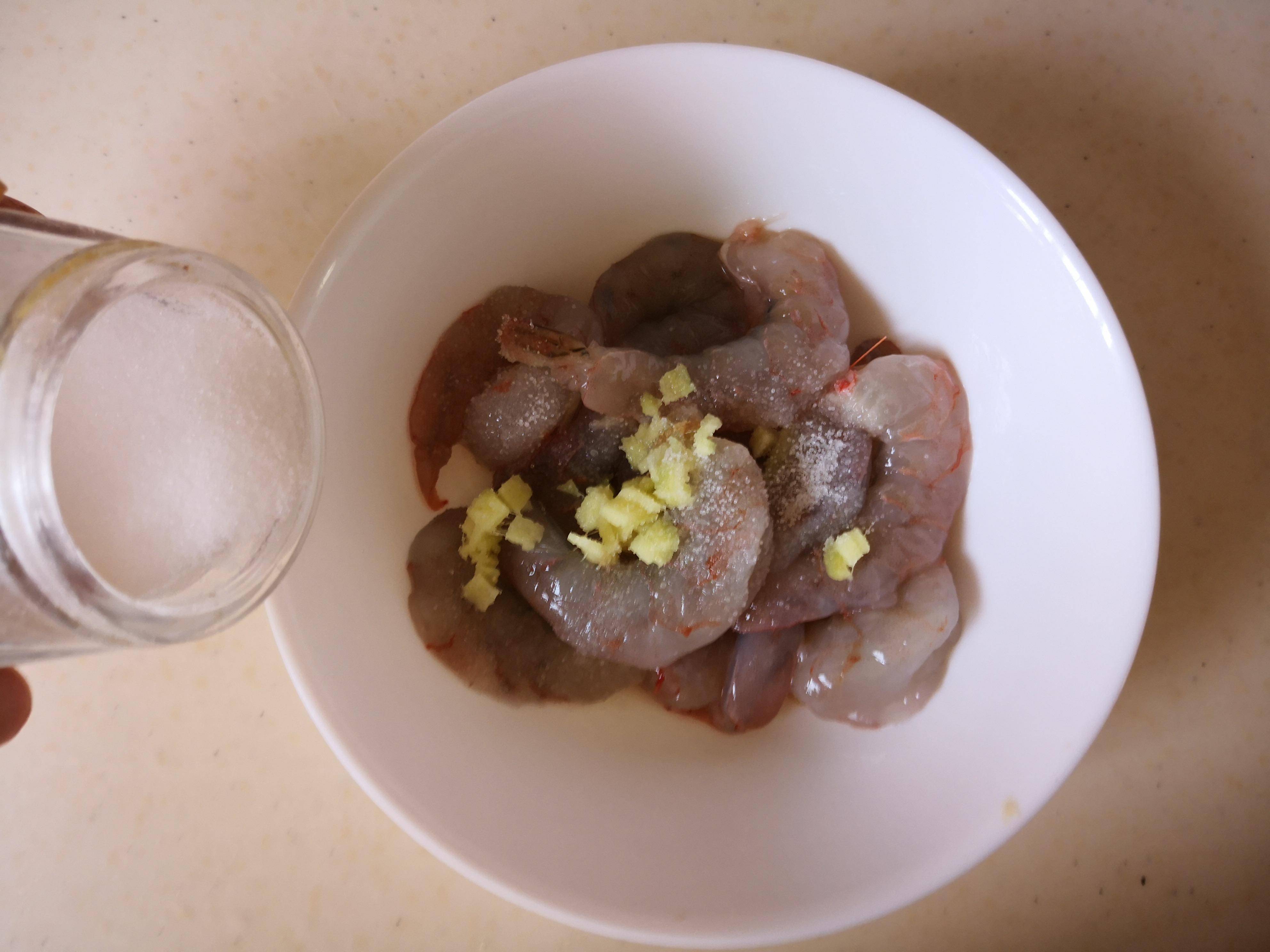 制作:1.鲜虾去壳后挑出虾线, 虾仁加入少许盐、料酒、淀粉和姜末等拌均匀腌制一下;