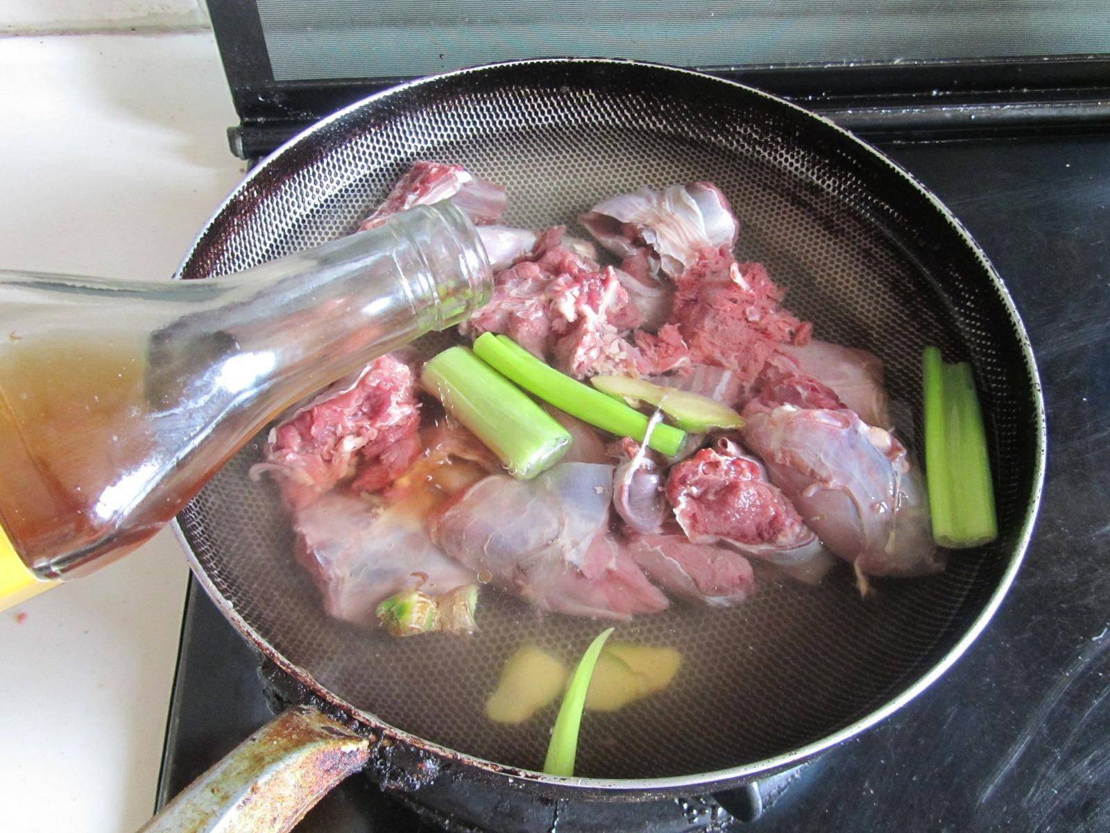 制作:1. 烧锅水,将兔肉冷水下锅焯煮,将姜、大葱段和高度白酒去腥,焯好后冲洗感觉备用;