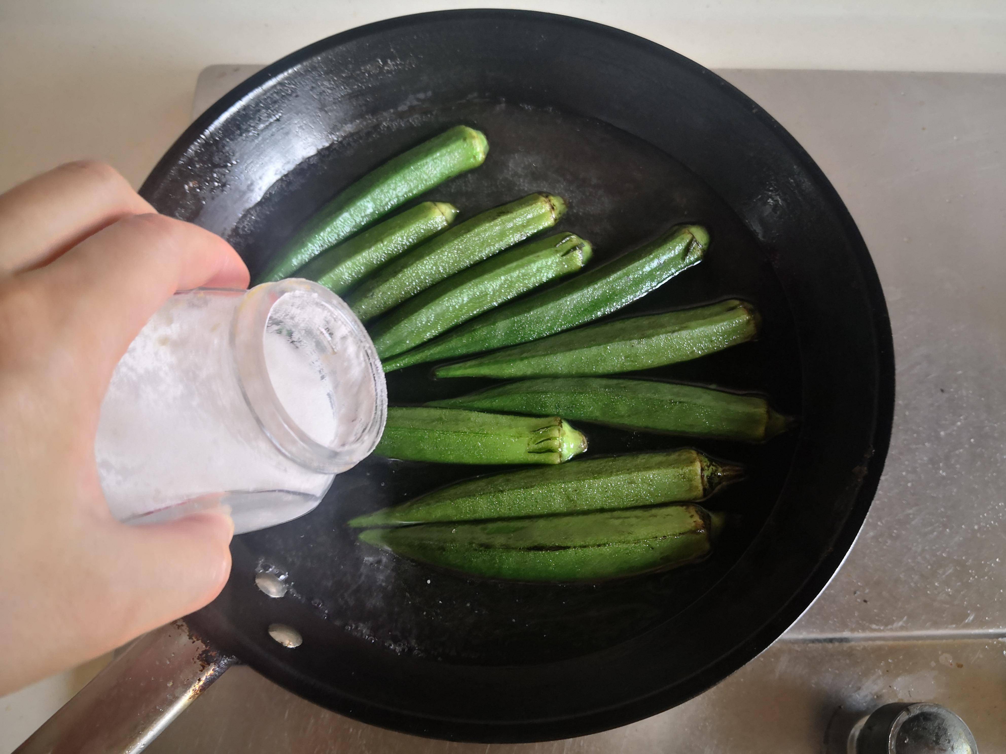 2. 烧锅水加入少许盐和几滴油,将整根秋葵放入锅中整根焯煮,这样能避免营养的流失,焯煮变色后捞出切片备用;
