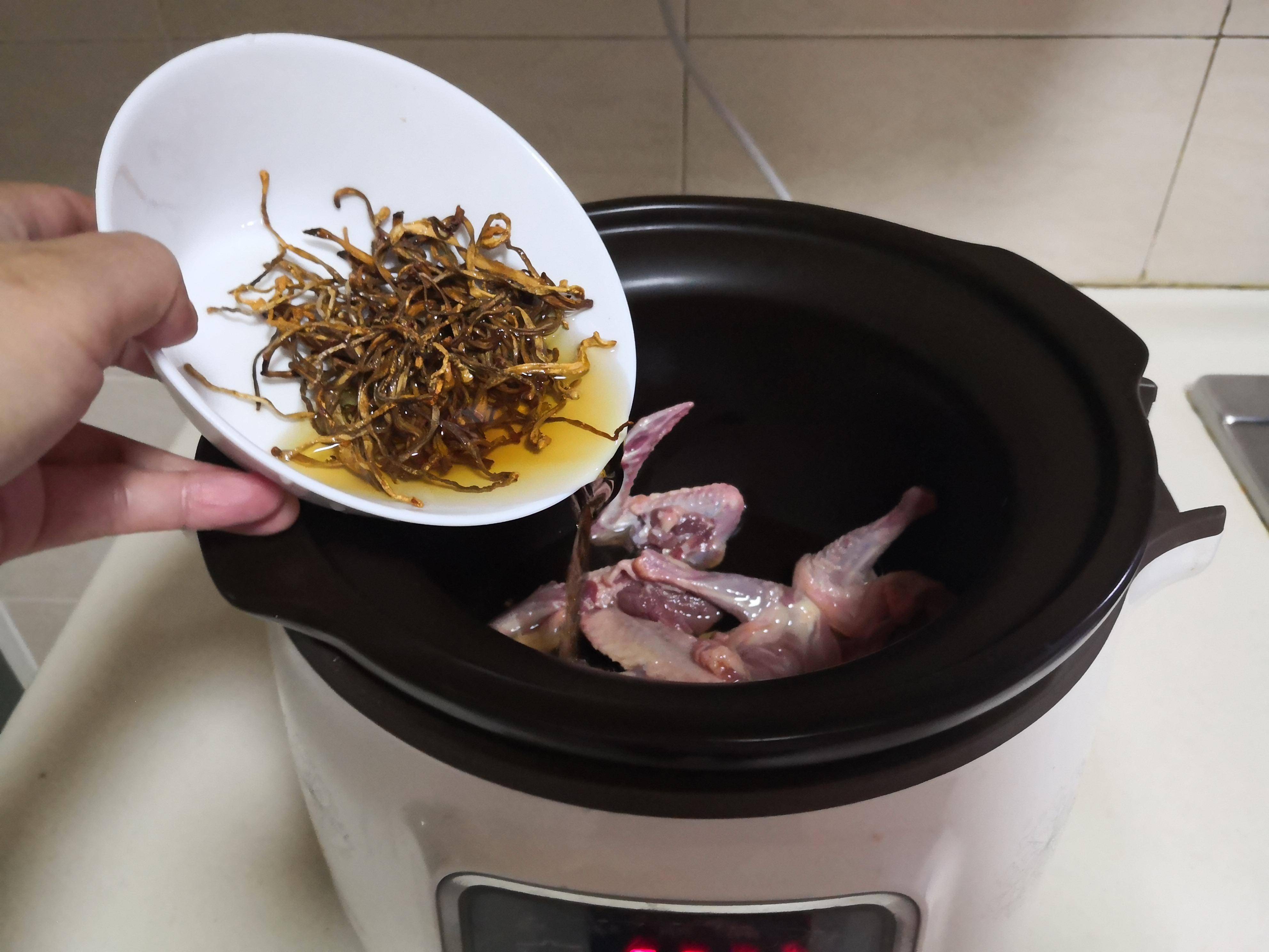 原料: 鸽子 1只 鹌鹑蛋 1小碗 虫草花 1小把 姜片 少许 胡椒粉 葱花 少许 盐 适量