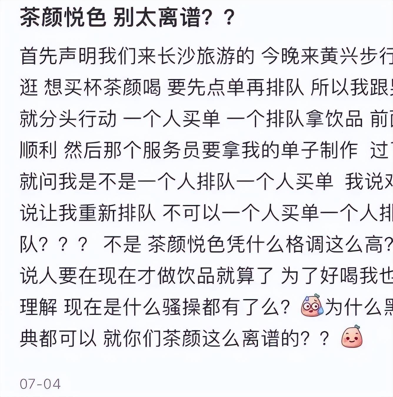 近日有消费者发帖称,她和朋友在长沙想去喝茶颜悦色,得知要先排队点单再排队取餐,于是两人分头行动,一个人负责排队点餐,一个人则提前到取餐的队伍里排队,谁知就因为这样,店员竟让她重新排队。该消费者认为茶颜悦色的做法“太离谱”。