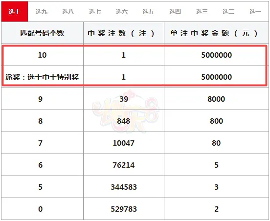 本次派奖活动除了设立选十中十、选九中九特别奖外,还设立特定玩法奖上奖,总奖金约3.09亿元,对选二、选三、选五、选六玩法进行派奖。具体派奖情况如下: