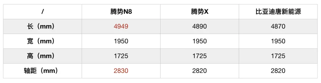 车长和轴距相比腾势X或比亚迪唐都有所提升,但同时从上面图表上也看得出来,腾势N8的车宽和车高都与后两者保持了完全一致,这也一定程度上反映了这三车之间密切关系。