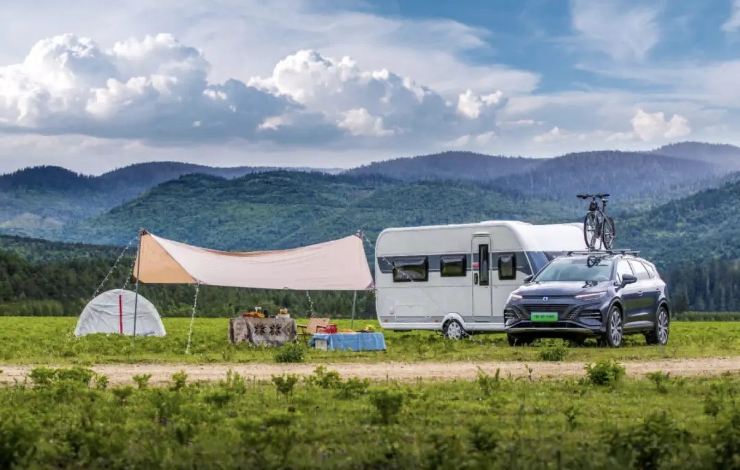 而腾势N8搭载的24.8kWh的电池包电量,搭配6kW对外放电功能,也足够满足外出露营用电需求,另外腾势N8还配置了拖车钩,可以合法拖挂着房车出行。