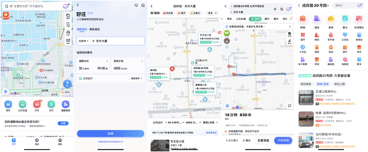 通过小徐的找房经历,不难发现,AI通勤租房功能为打工族提供了省时、高效的智能找房体验。据了解,通过AI算法的融合创新,百度地图AI通勤租房功能可从通勤目的地、通勤时长、出行方式、租金价格等多个维度提供租房建议,便于我们了解公司附近、符合个人需求的住处,还能看到小区周边的基础配套设施,餐厅、商场、交通站点、医院等生活版块也都尽在掌握。