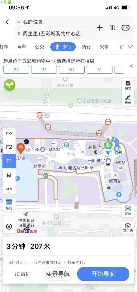 我在商场北门打开百度地图的步行导航,系统会自动定位并切换至商场内部路线,这时它会提醒你选择所在楼层,选择好之后点击开始实景导航就可以了。