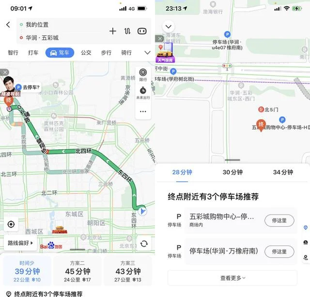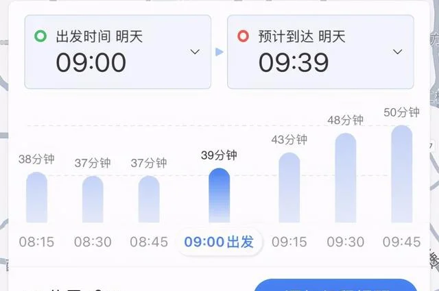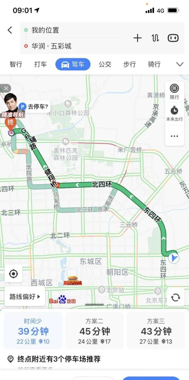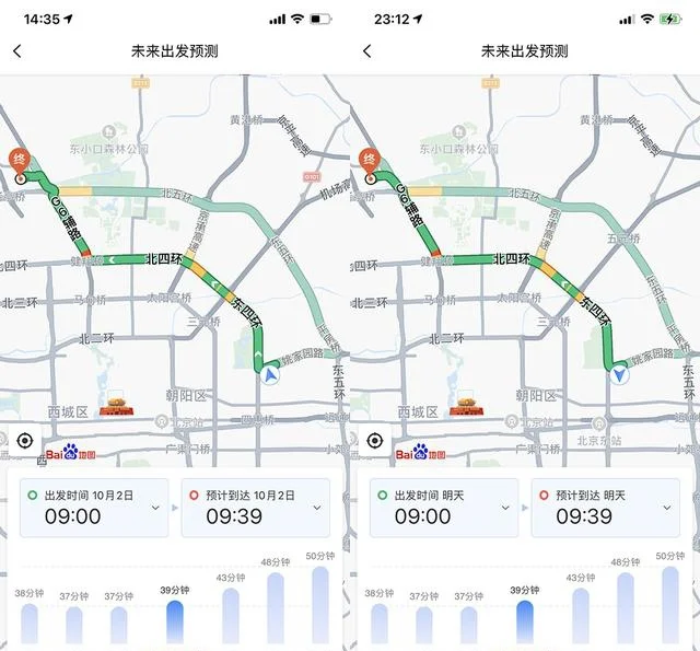 9月27日,我使用「未来出行」第一次预测10月2日从北京东四环出发到华润五彩城的用时,百度地图给我的预估时间是39分钟。在10月1日我又进行了一次预测,数据基本和上一次保持一致。当然,你也可以通过百度地图根据到达时间反推出发时间。
