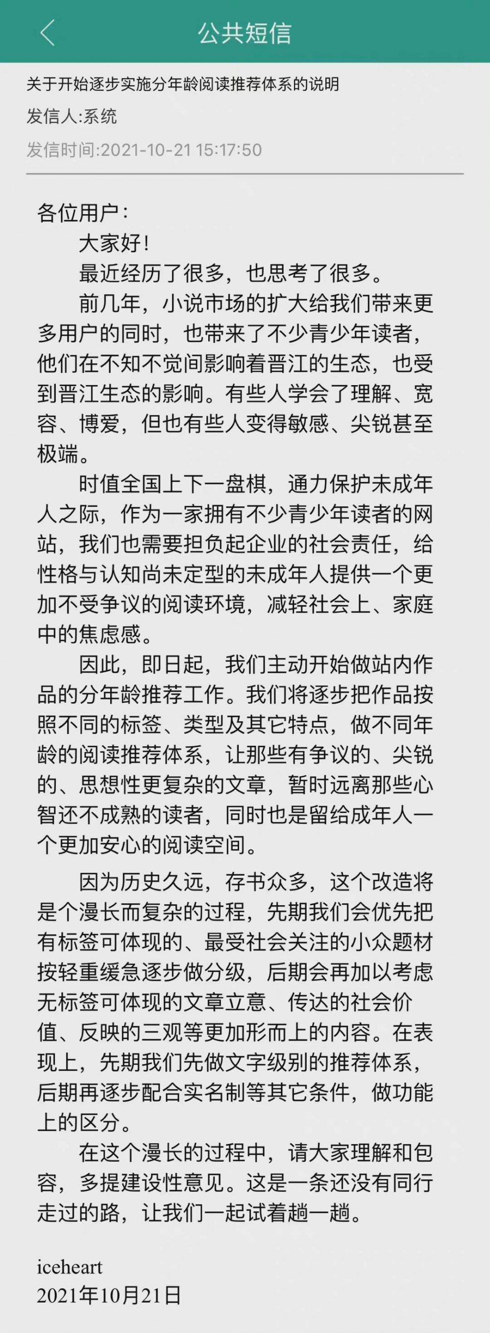 10月21日,晋江文学城发布公告,将实施分年龄阅读推荐体系,未来将逐步开始做站内作品的分年龄推荐工作。
