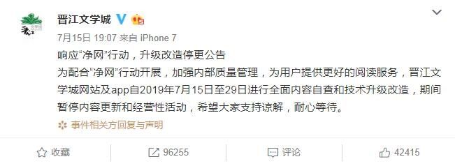 晋江文学城停更。7月15日晚间,晋江文学城在微博发布公告称,为配合“净网”行动开展,加强内部质量管理,为用户提供更好的阅读服务,晋江文学城网站及App自2019年7月15日至29日进行全面内容自查和技术升级改造,期间暂停内容更新和经营性活动。
