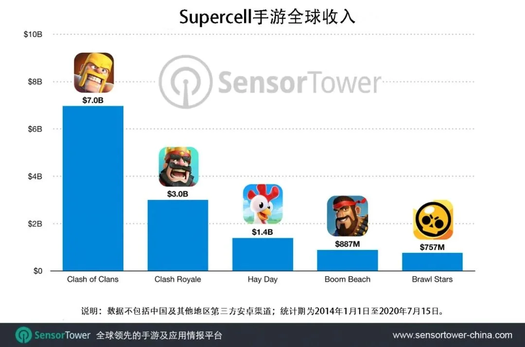 Supercell 旗下另外几款作品,2014 年 1 月发行的《Hay Day 卡通农场》,目前总收入为 14 亿美元;《Boom Beach 海岛奇兵》和《Brawl Stars 荒野乱斗》总收入分别为 8.87 亿美元和 7.57 亿美元。《皇室战争》作为即时策略,卡牌和 MOBA 品类融合的开创者,目前仍没有竞品能挑战其领导地位。